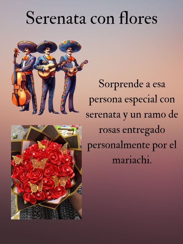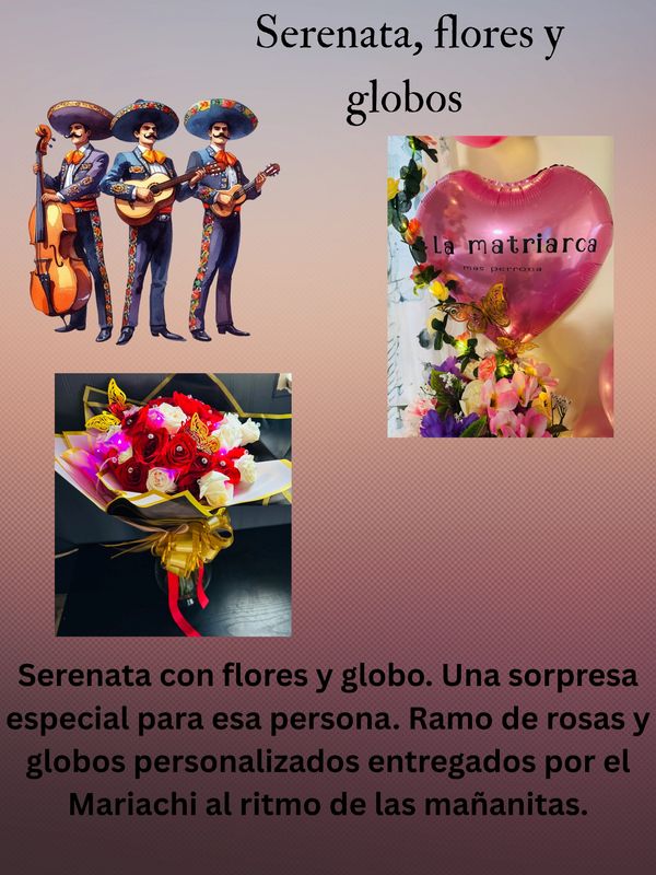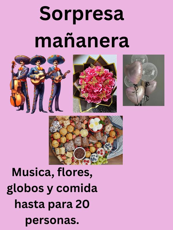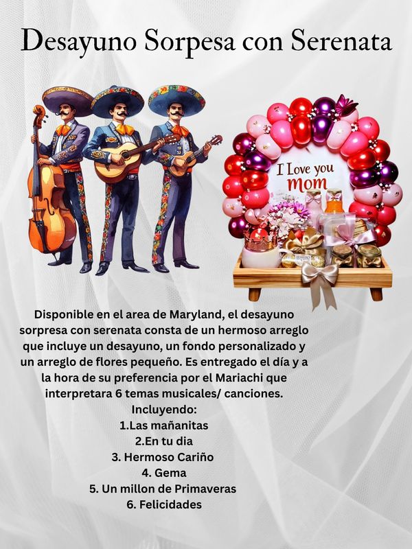 Una hora de Musica de Mariachi, arreglo floral para esa persona especial, globos y un desayuno para tus invitados.